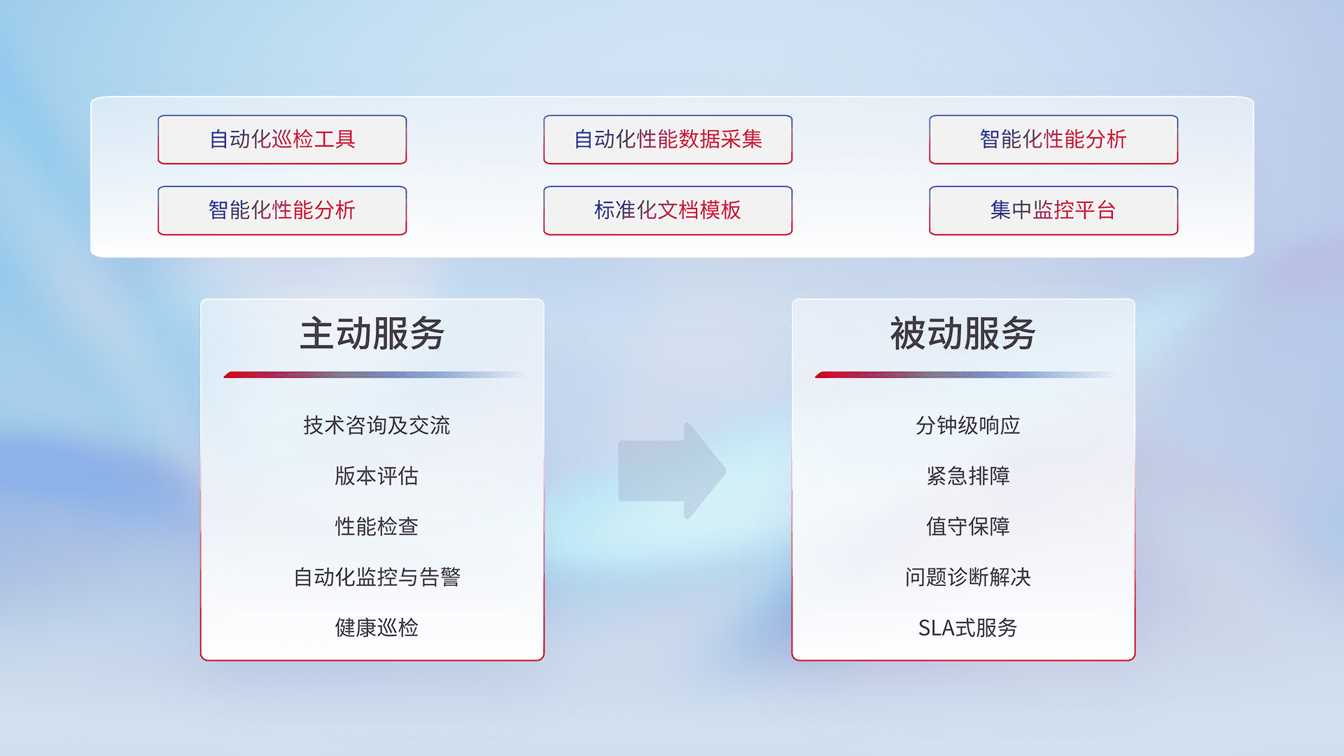 智能化工具和标准化文档,,,,保障服务质量,,,提供主动服务(包含技术咨询、、、版本评估、、、、性能检查、、自动化监控与告警、、、健康巡检)和被动服务包含(分钟级响应、、紧急排障、、、值守保障、、、问题诊断解决、、、、SLA服务)。。。